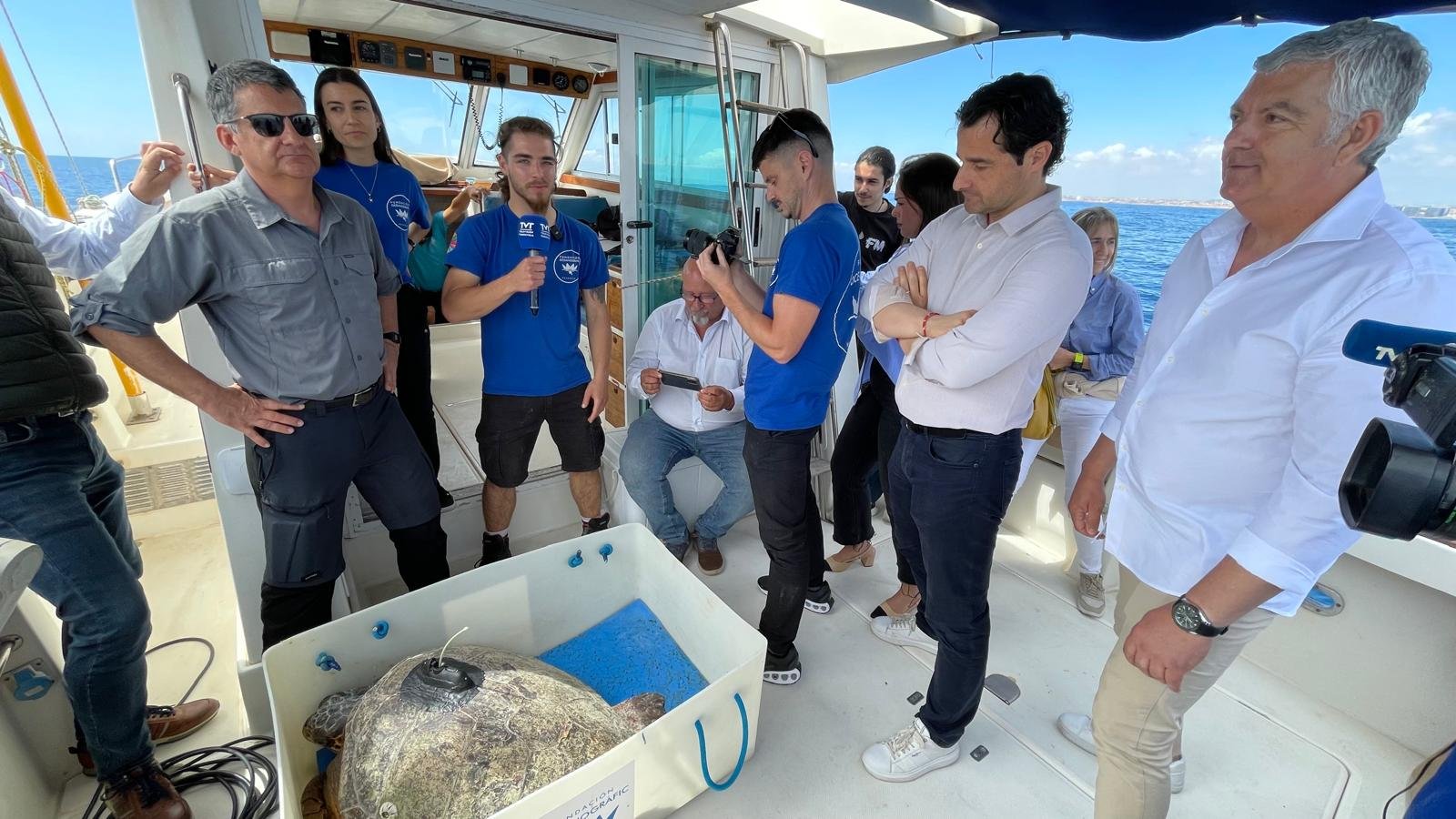 The release took place from a boat off Torrevieja’s coast, attended by Mayor Eduardo Dolón, Environment Councilor Antonio Vidal, municipal biologist Juan Antonio Pujol, Real Club Náutico president Carlos Carmona, and Oceanogràfic veterinarians.
