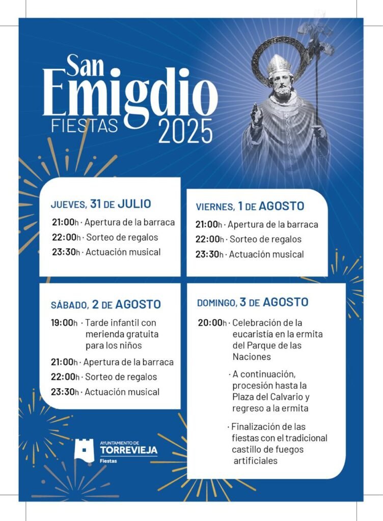 Parque de las Naciones in Torrevieja will host the San Emigdio festivities from Thursday, July 31, to Sunday, August 3. The event, organized by the City Council’s Department of Festivities, celebrates the town’s co-patron and protector against earthquakes, writes El País.